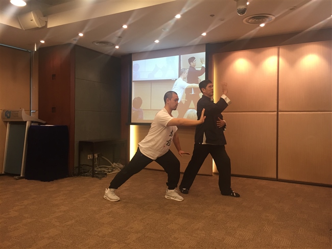 夏師父於香港城市大學內於來自上海體育學院的邱教授一起演示太極拳的獨一無二,吸引了很多學生以及街坊前來聽取,大家反應熱烈。