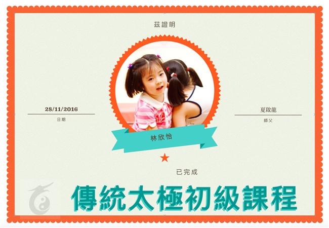 應一些家長要求,龍太極於12月新開一班兒童傳統太極拳證書課程,小小學員學完基本套路之後便可以獲得以下證書